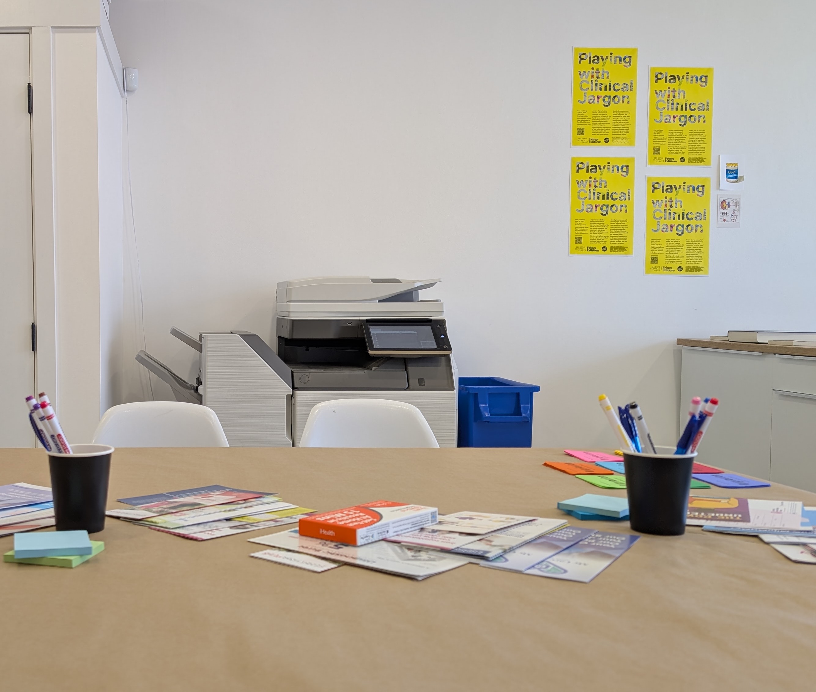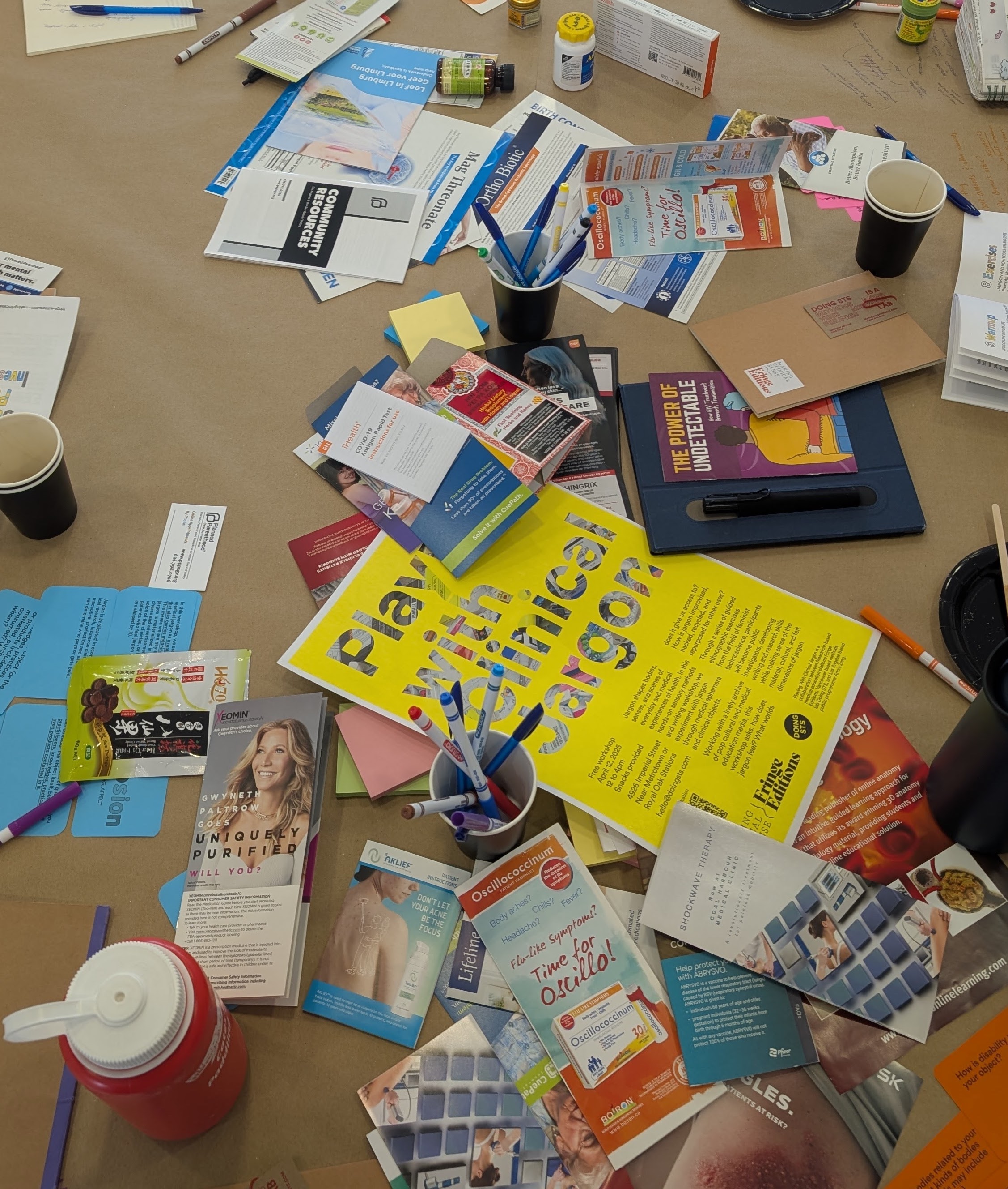 A couple of things: definitely the materiality came from a very STS-based approach, but also because there were three of us living in three different locations, also with very different languages as well: Dutch, where Anna (ed. Anna Harris) was; Mathew (ed. Mathew Arthur), our collaborator, in Vancouver; and I was in Los Angeles. It was one way to ground us in the medical communities locally and bring that material into research. We went to local community clinics to collect ephemera. In that way, it was a very nice way to ground all of us in these different sites ethnographically and bring that to the workshop. Mathew also brought in the exercise of ‘writing hundreds,’ inspired by Kathleen Stewart and Lauren Berlant. Additionally, we worked through an adapted framework of implosion originally developed by Donna Haraway and Joseph Dumit. Lastly, another aspect we brought was creative writing, reading and exquisite corpse. In the beginning, we did a warm-up just to get people comfortable in the space. We picked up the objects we had, and people started reading from them, picking out words that stood out to them. Then we read them aloud in an exquisite corpse fashion to form a poem and made a recording of it. It was really interesting, because it was a great way to get people to sound, hear their voices, and come together as an intro, but also it was a way to get us started thinking about which words were hard to pronounce or were unfamiliar. Where were we tripping over? That really introduced us to the idea of how foreign of a language medical jargon can be sometimes, even if you're speaking the language you think you're speaking.